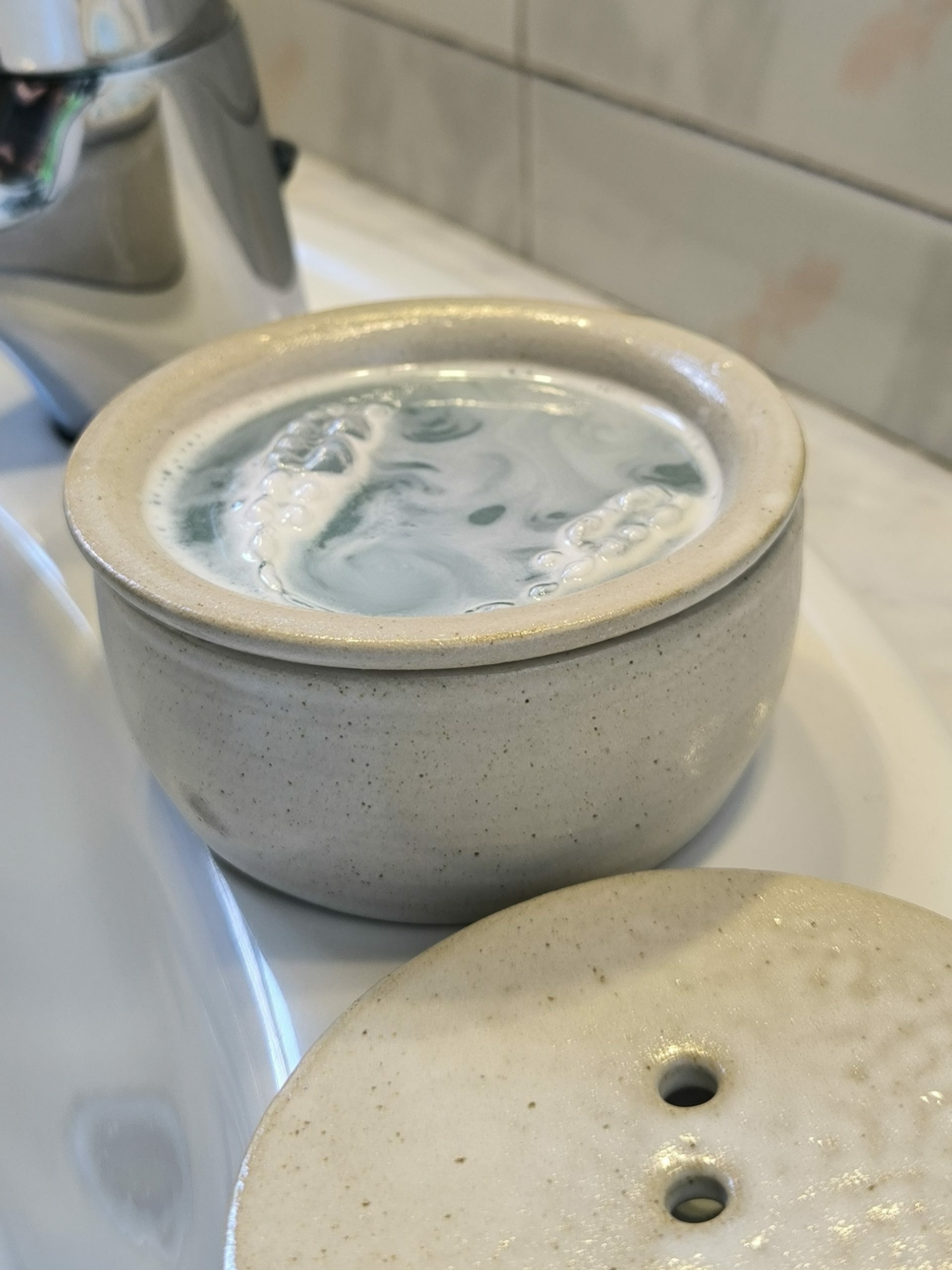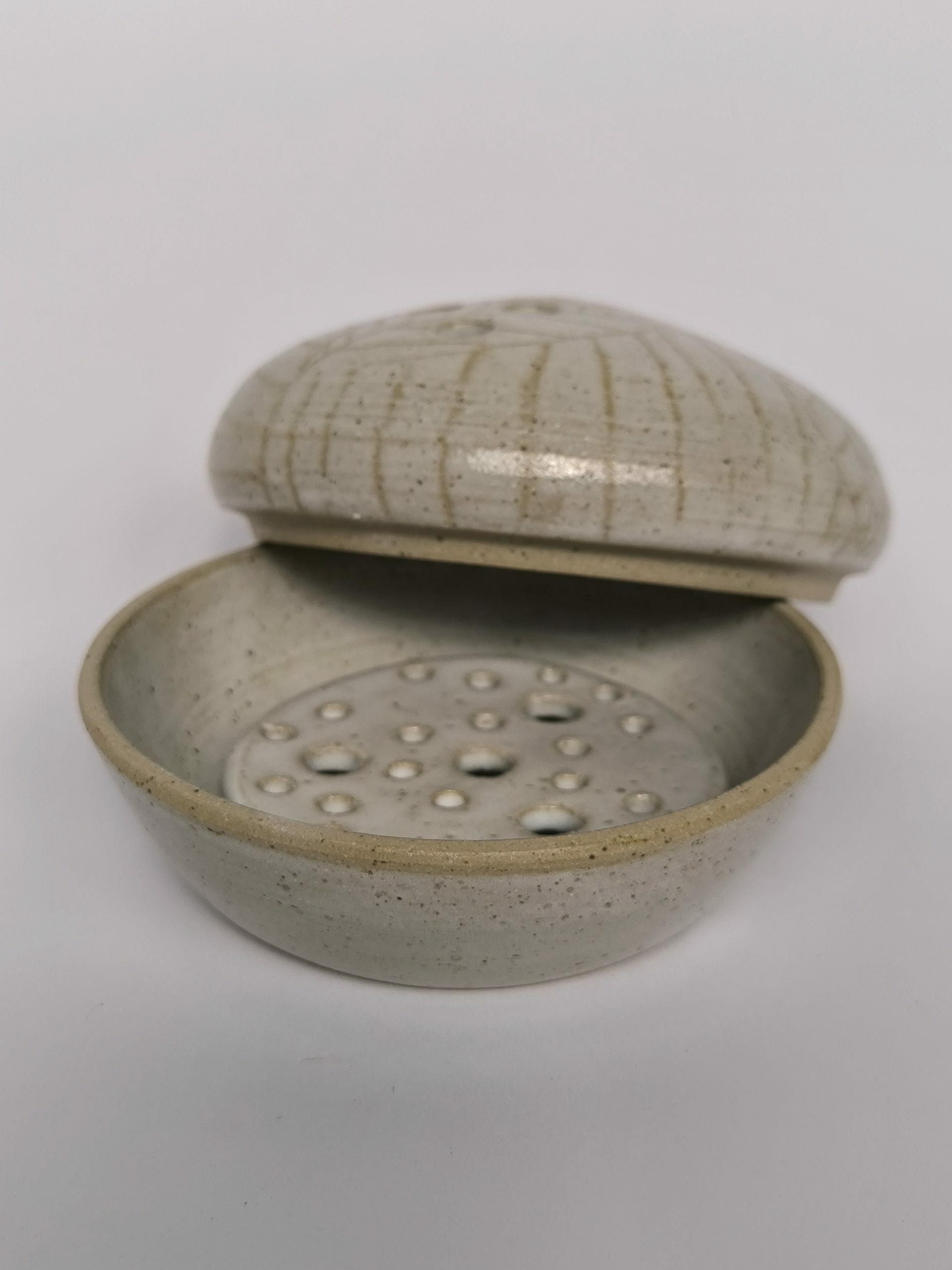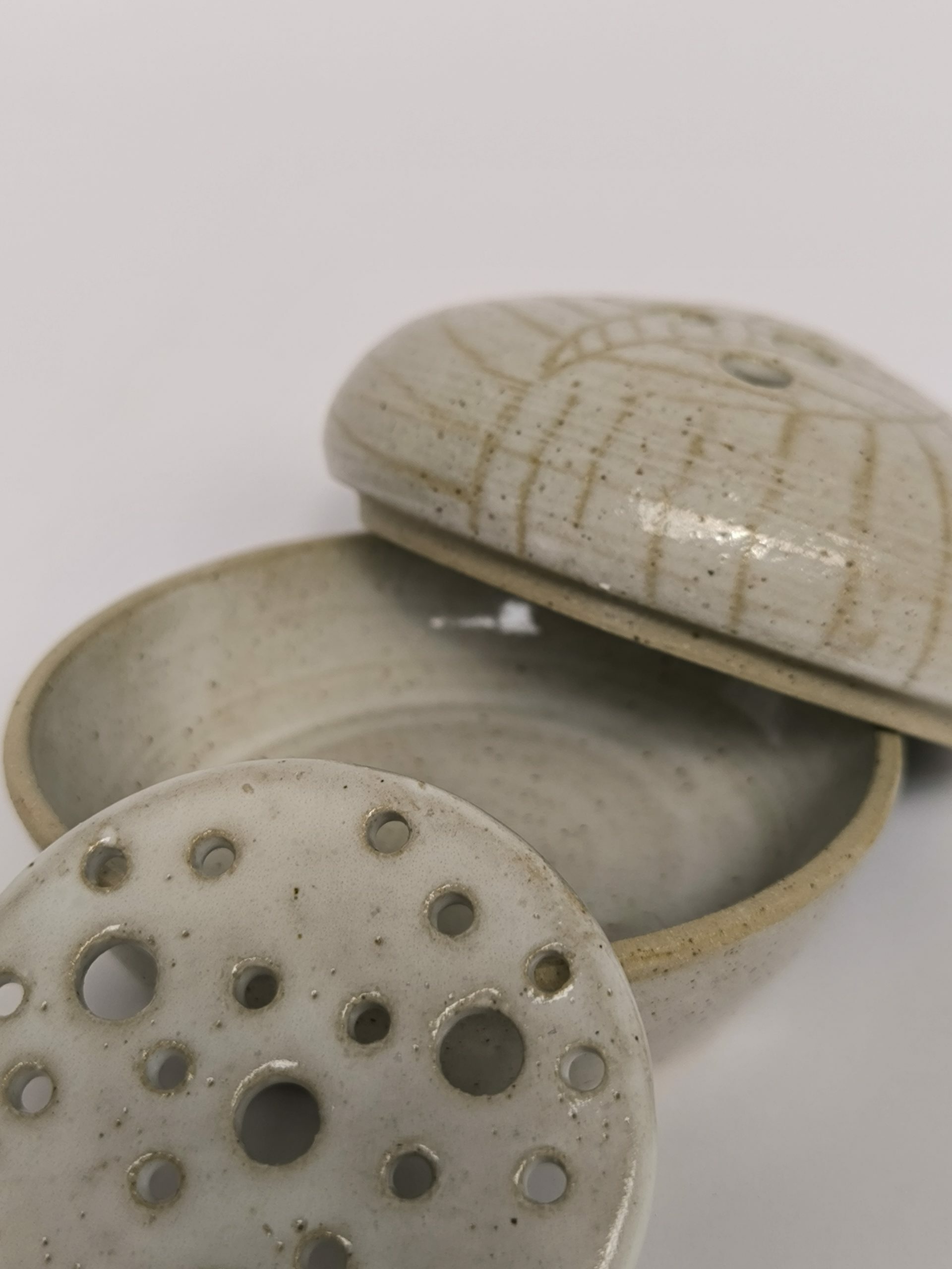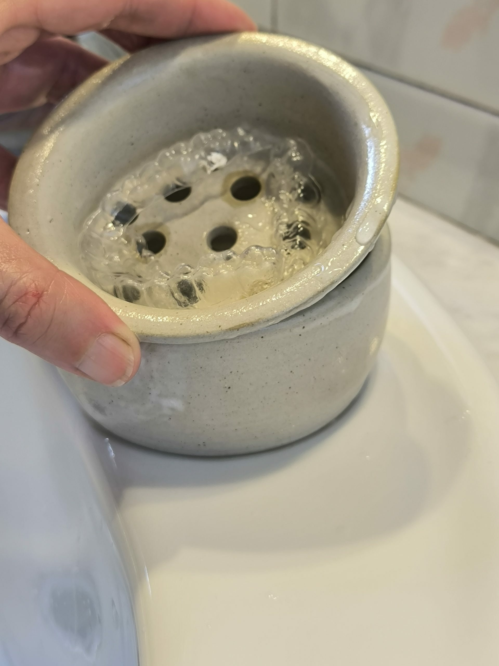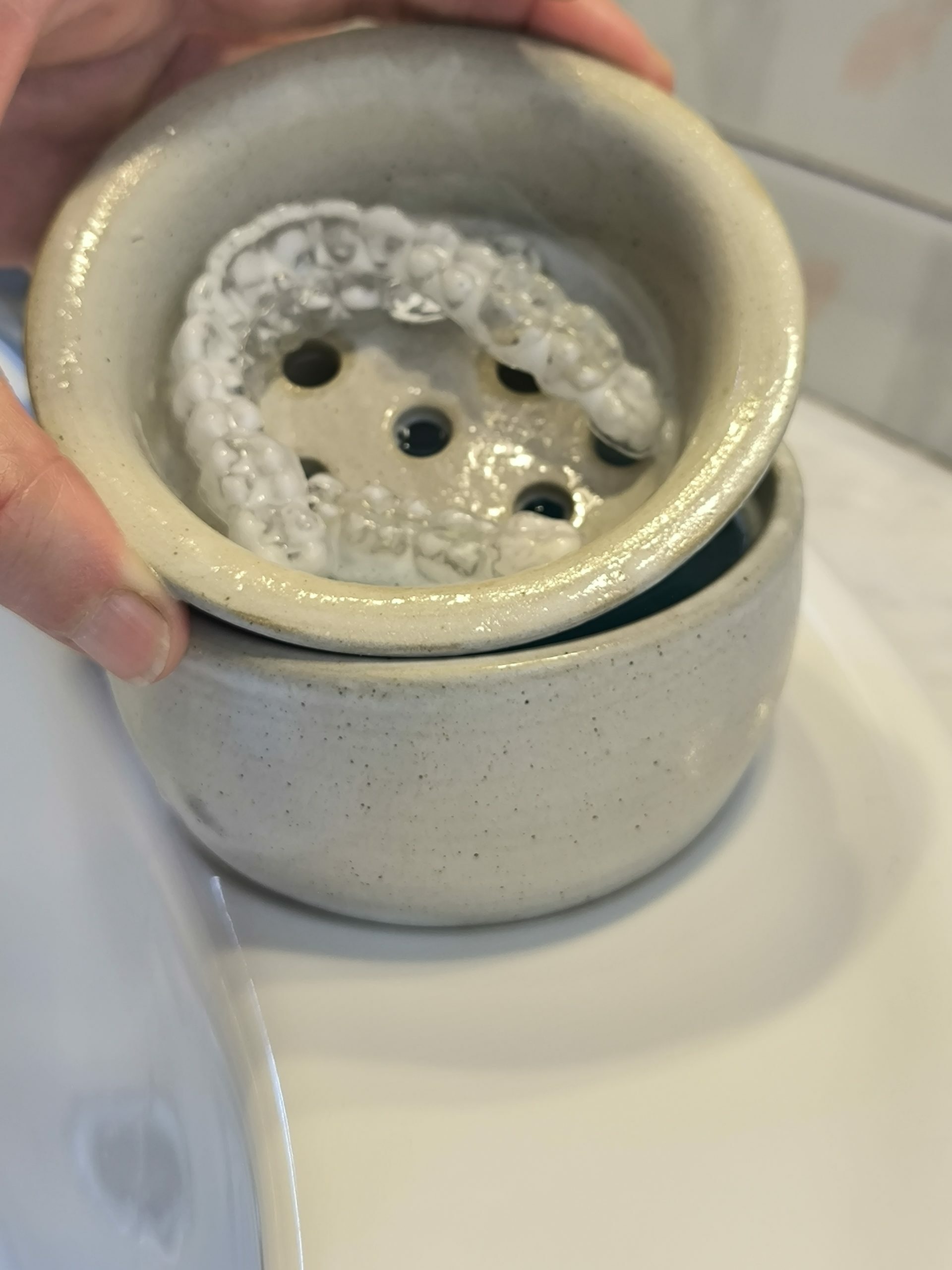 Caixa amb colador per guardar i netejar la fèrula dental.